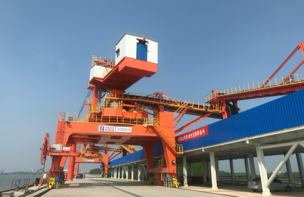 為適應電廠、港口等用戶的需求,公司2003年為連云港新陸橋設計總包的3000/1000t/h、2005年為太倉電廠設計總包的1500/600t/h裝卸一體機,現已為用戶提供了可裝多種物料如煤、砂石料、水泥、石膏的裝船機、全封閉帶除塵環保裝船機,生產的最大生產率裝船機為南京西壩的4500t/h裝船機,后又為池州九神山提供了5臺3000t/h裝船機于2019年6月正式投入使用。